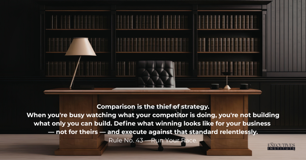 In business—and in life—it’s dangerously easy to drift into someone else’s race. You chase their milestones. You react to their moves. You measure your progress against their timeline. Before long, you’ve built a strategy fueled by comparison instead of conviction. This rule cuts through that noise. Run Your Race is a brutal reminder that the real battle is internal. The winners aren’t the ones who start the flashiest. They’re the ones who stay locked in when no one’s watching.