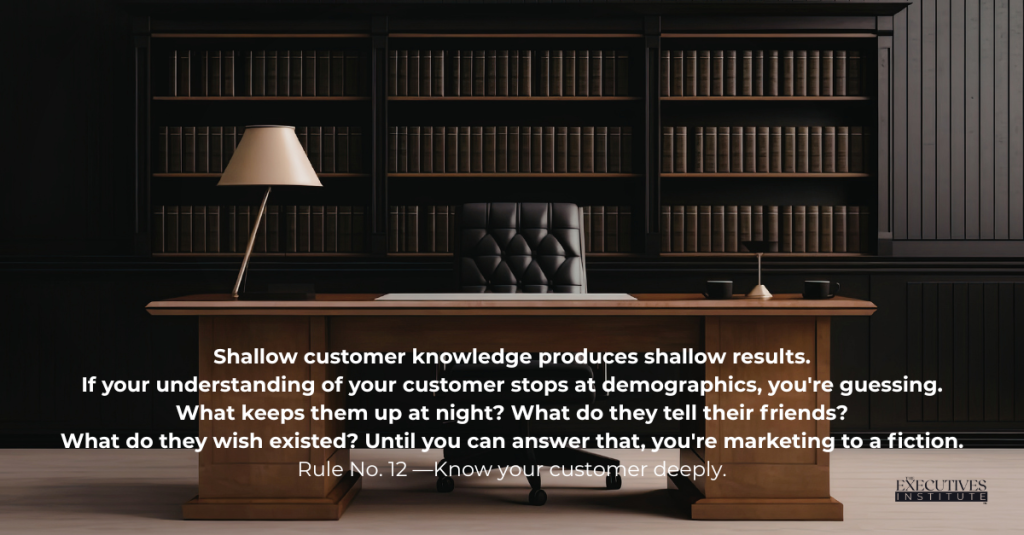 Too many businesses operate on assumptions â chasing trends and mimicking competitors. But the ones who endure, the ones who lead, take the time to know their customer at a level most never reach. This isnât about surveys or generic feedback. Itâs about getting inside the mind and daily reality of the people you serve. This rule demands more than surface-level data; it requires insight into your customerâs motivations, frustrations, values, and unmet needs â the things they might not even articulate themselves.